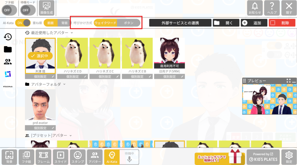 メニュー画面の「AI-Kata」をクリックし、使用するアバターを選択します。