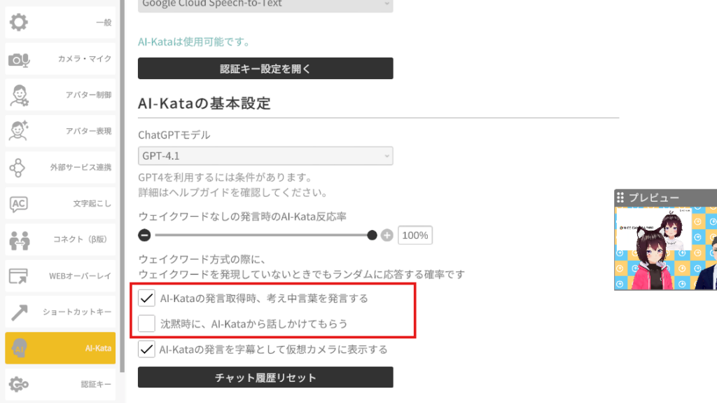 「沈黙時に、AI-Kataから話しかけてもらう」・・・ユーザーの発言が無い場合に、定期的にAI-Kataが話し出します。