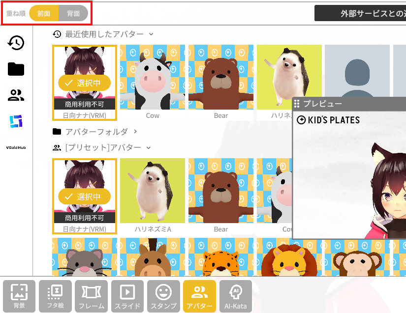 アバターパネルに「重ね順」UIが追加されました。この機能では、アバターの表示重ね順を変更し、「前面」に設定することでフレームの手前にアバターを表示することができます。今までは難しかったアバター表現をしてみましょう。